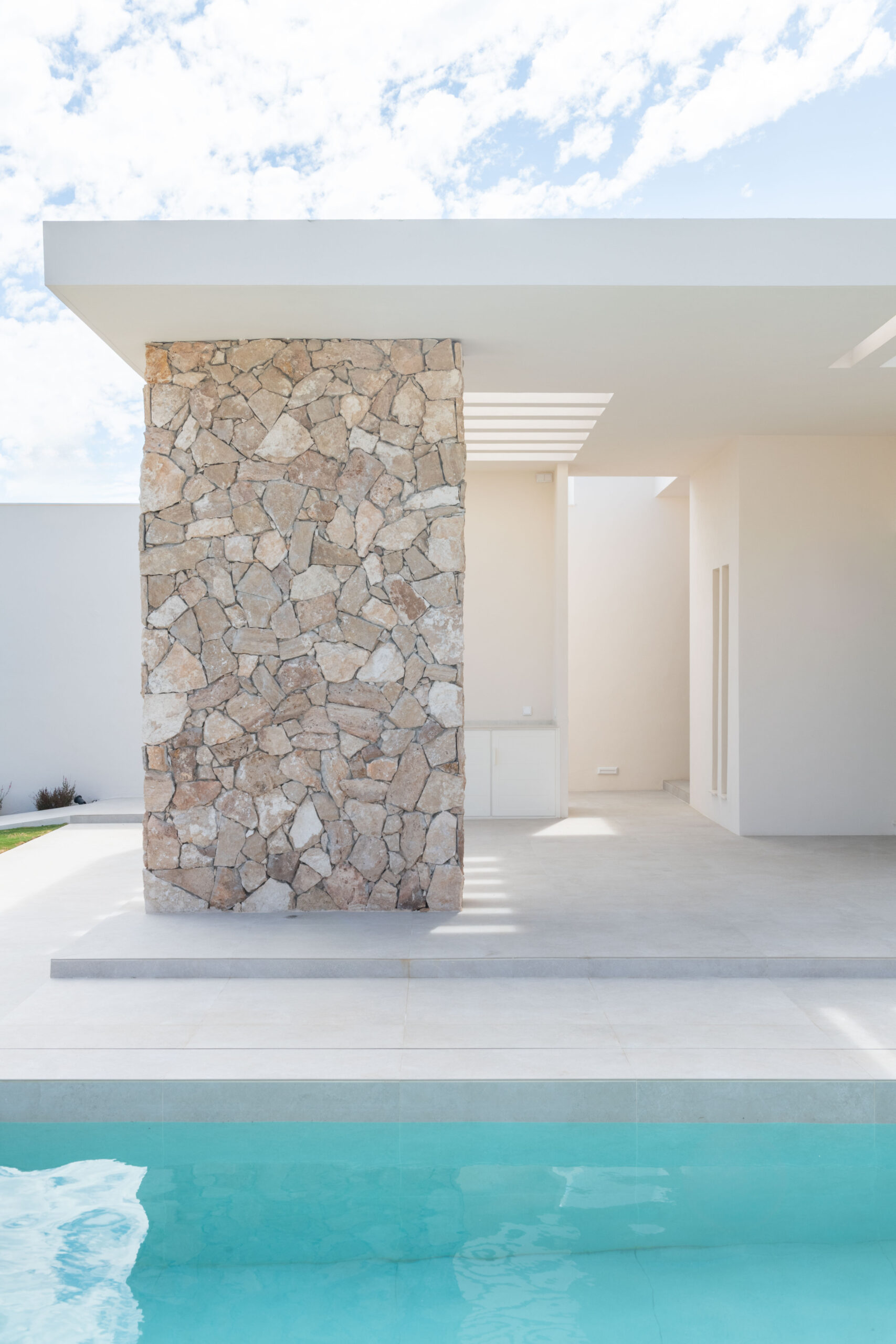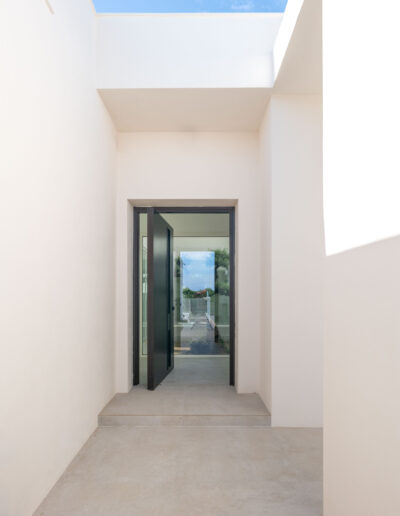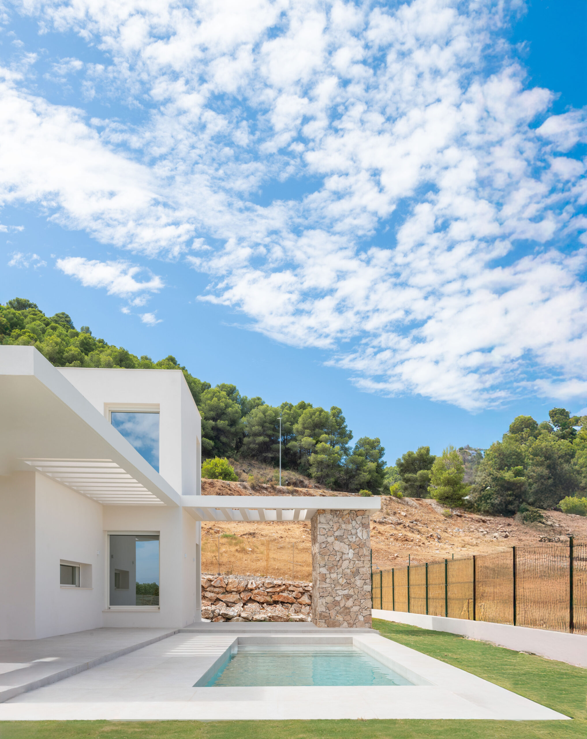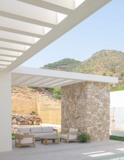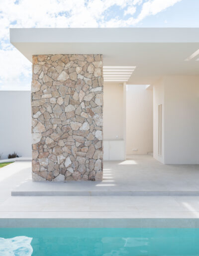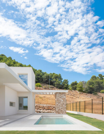 La vivienda cuenta con tres módulos claramente diferenciados pero conectados entre sí. Por un lado, el módulo de función de día que recoge las estancias de cocina, comedor y salón, y que conecta con los espacios exteriores de relación de porches y piscina; y por otro, la zona de función de noche que cuenta con dos módulos de habitaciones, uno correspondiente a los dormitorios de los hijos equipado con su propio baño, y otro donde se ubica el dormitorio principal equipado con vestidor y baño propios.