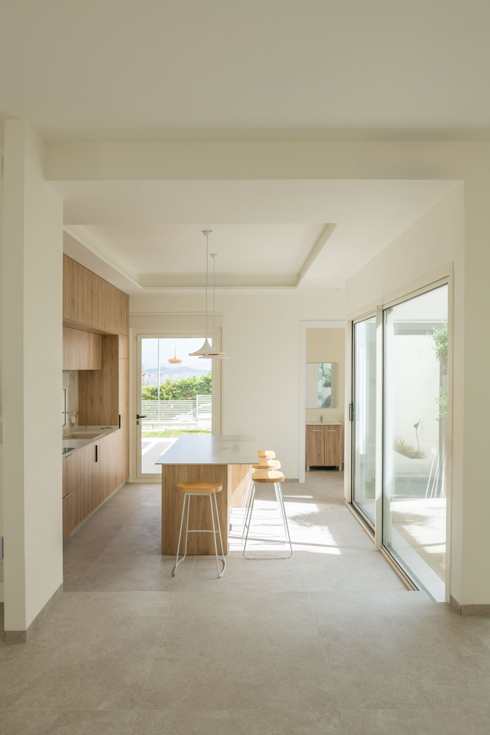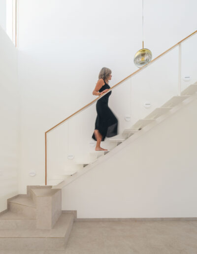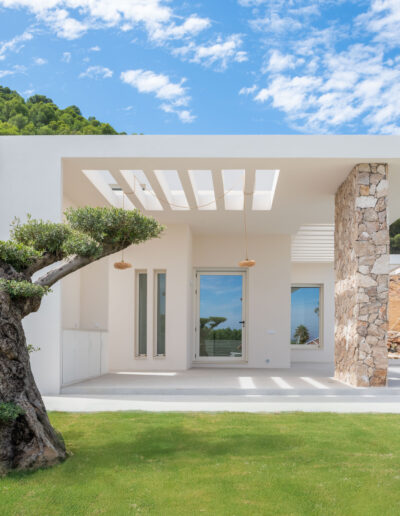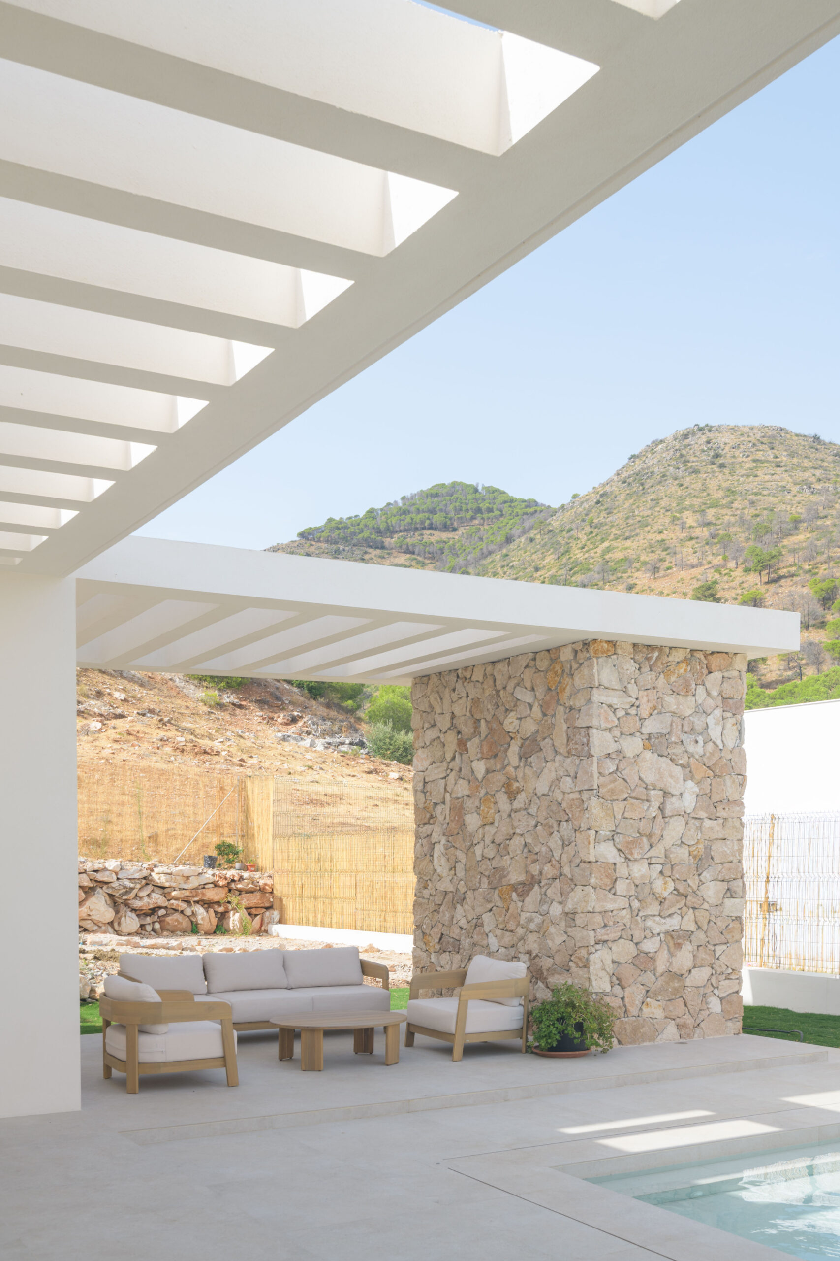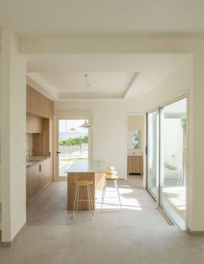 La vivienda cuenta con tres módulos claramente diferenciados pero conectados entre sí. Por un lado, el módulo de función de día que recoge las estancias de cocina, comedor y salón, y que conecta con los espacios exteriores de relación de porches y piscina; y por otro, la zona de función de noche que cuenta con dos módulos de habitaciones, uno correspondiente a los dormitorios de los hijos equipado con su propio baño, y otro donde se ubica el dormitorio principal equipado con vestidor y baño propios.