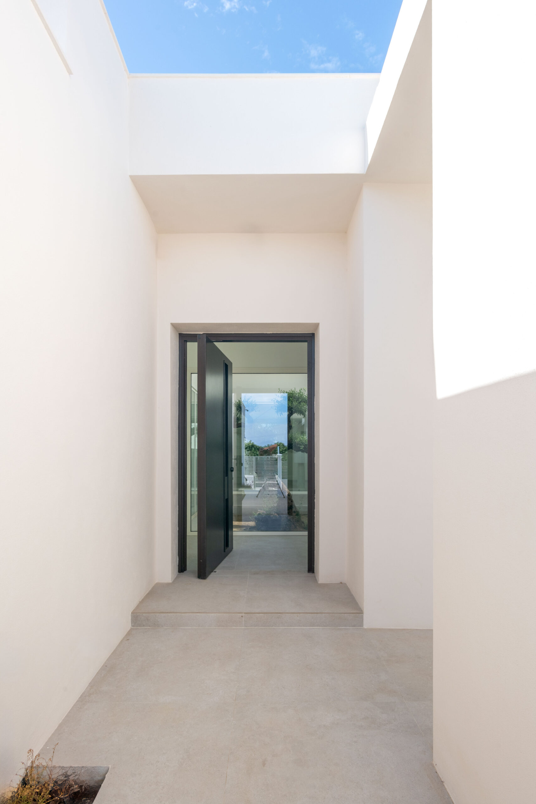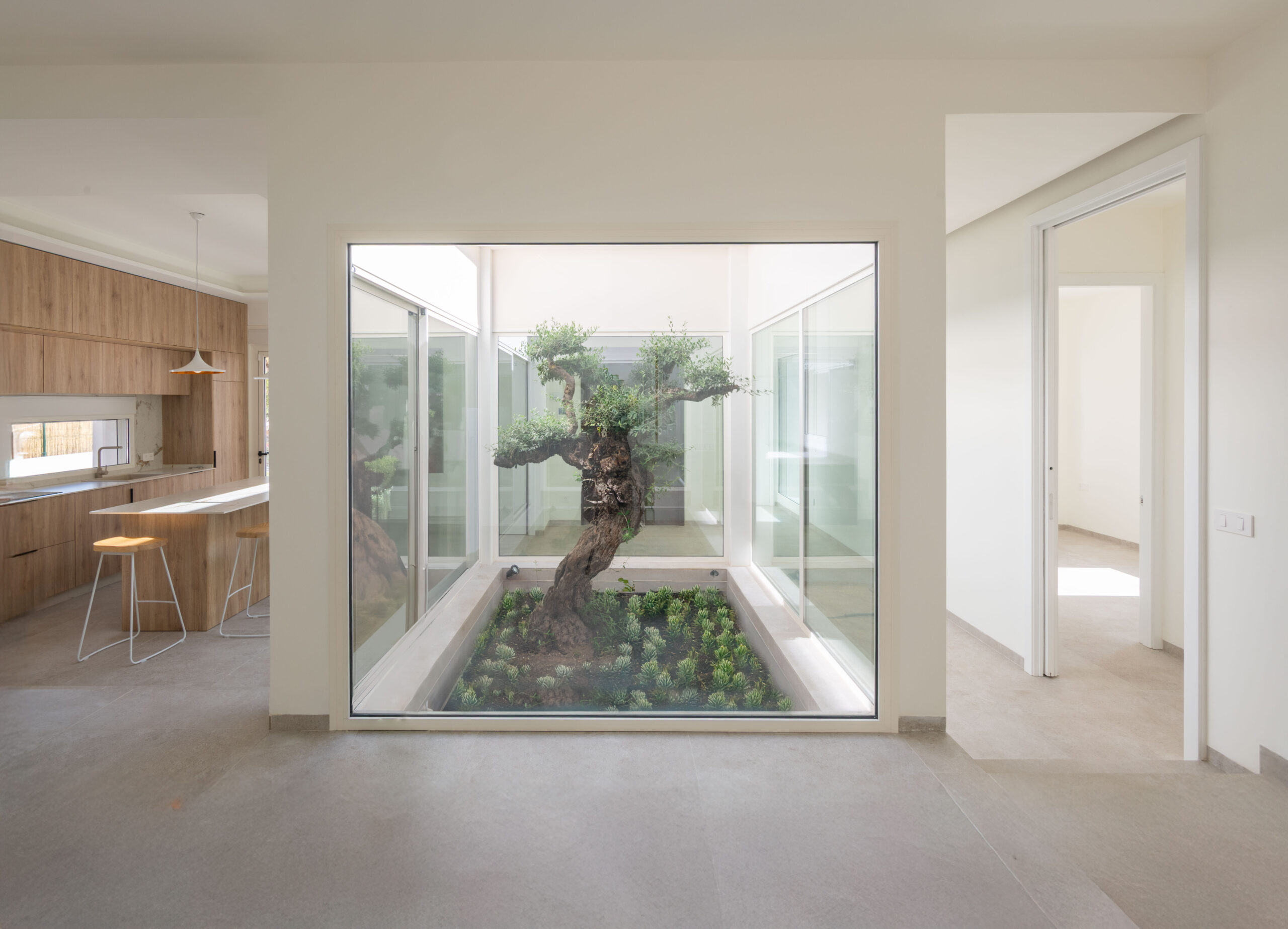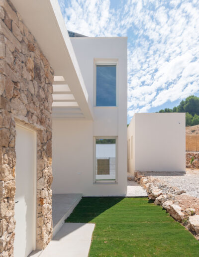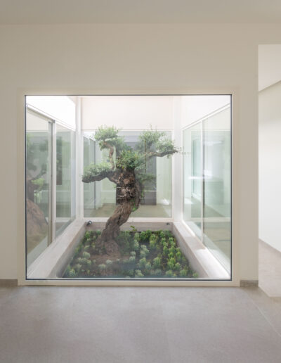 La edificación cuenta con un cuerpo de garaje dispuesto lateralmente en la parcela y conectado interiormente con el resto de la vivienda. Ésta se organiza alrededor de un pequeño patio interior ajardinado sobre el que se circula, una vez traspasado el vestíbulo de entrada, para acceder a las distintas estancias permitiendo a los usuarios el cruce de visuales internas.